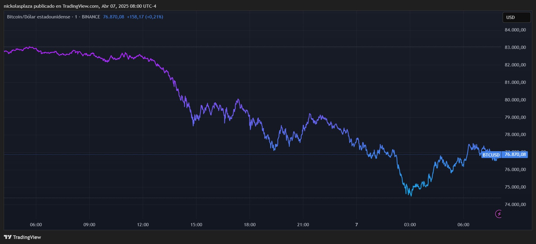La caída del 7% en el precio de bitcoin en las últimas 24 horas, como se aprecia en el siguiente gráfico de TradingView, no ocurre en el vacío. Factores macroeconómicos y políticos ejercen una presión determinante sobre los mercados.