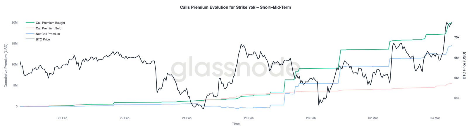Según Glassnode, en los últimos días se negociaron cerca de 14,5 millones de dólares en primas netas en opciones call, vinculadas al strike de 75.000 dólares.