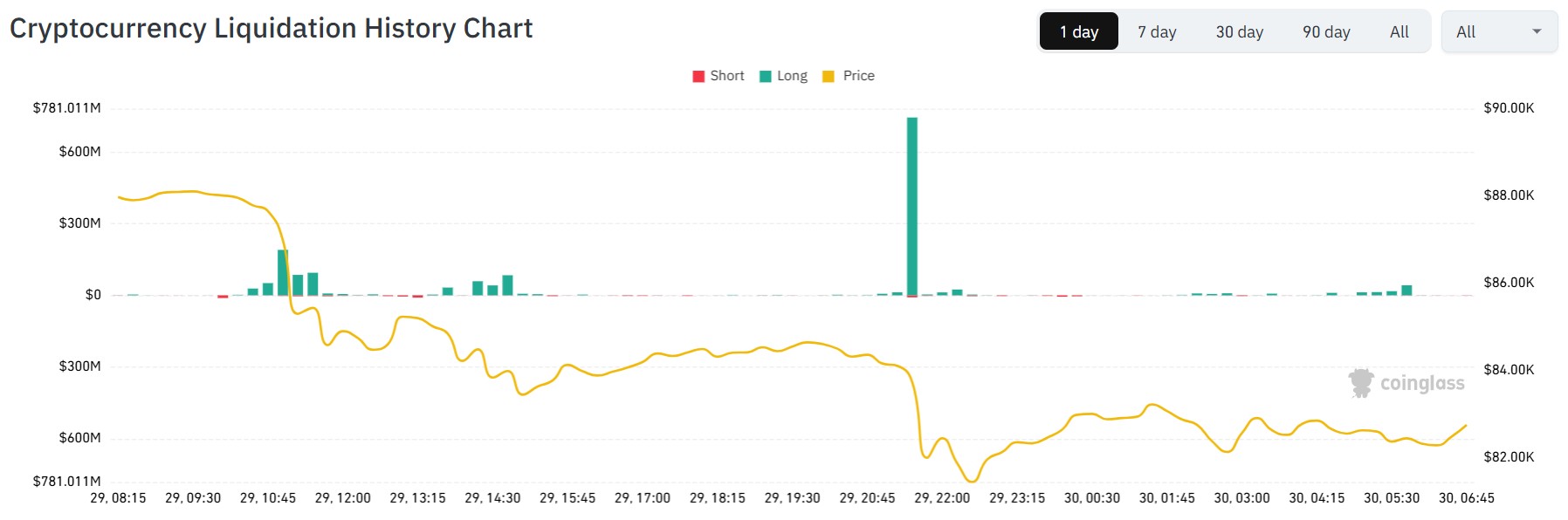 A continuaciรณn, el grรกfico facilitado por CoinGlass permite visualizar estas liquidaciones; que incluye operaciones en todos los activos digitales, no รบnicamente en BTC.