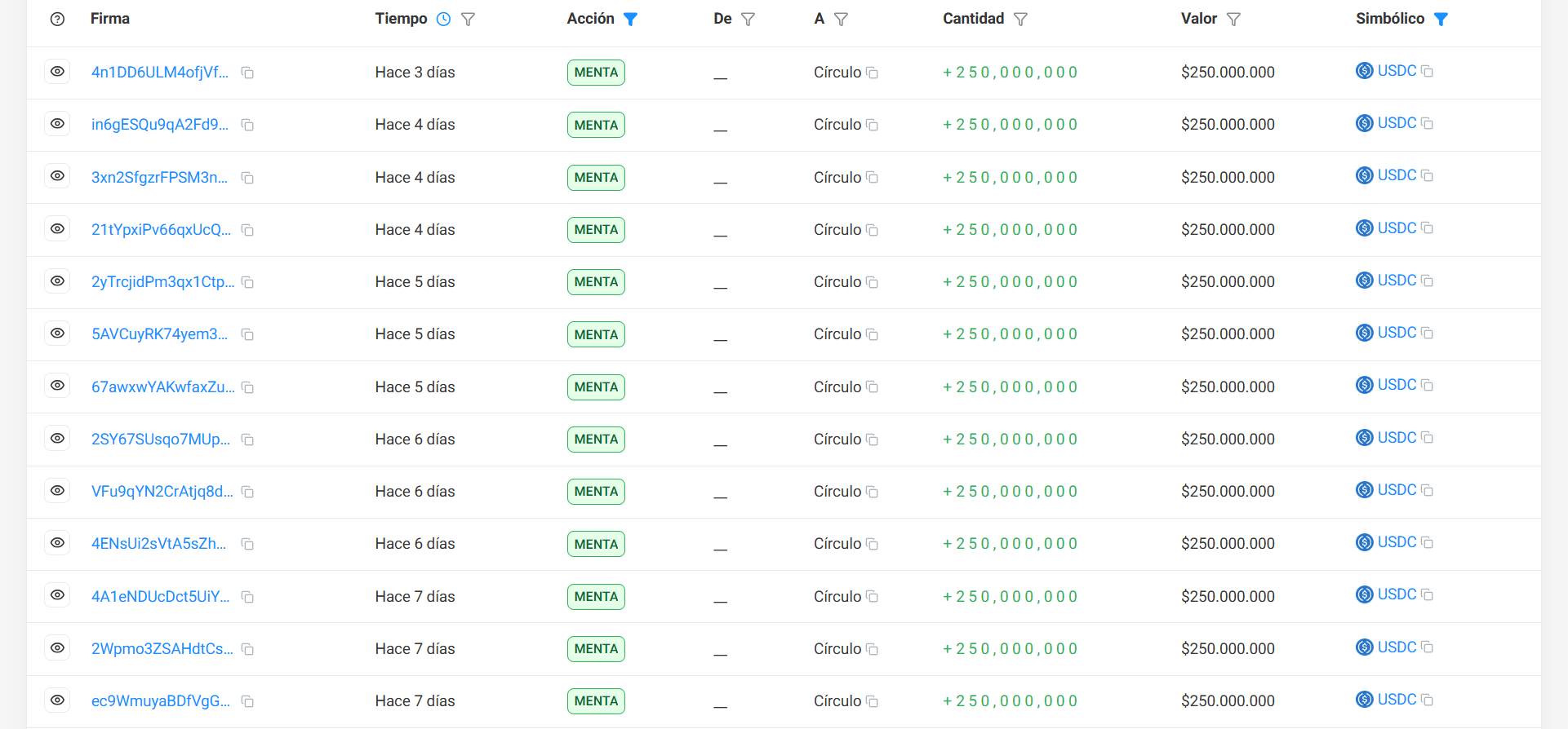 La creación de estos nuevos activos se realizó mediante un proceso técnico organizado, donde los tokens fueron emitidos y liberados en varias tandas de 250 millones cada una, como se ve a continuación.