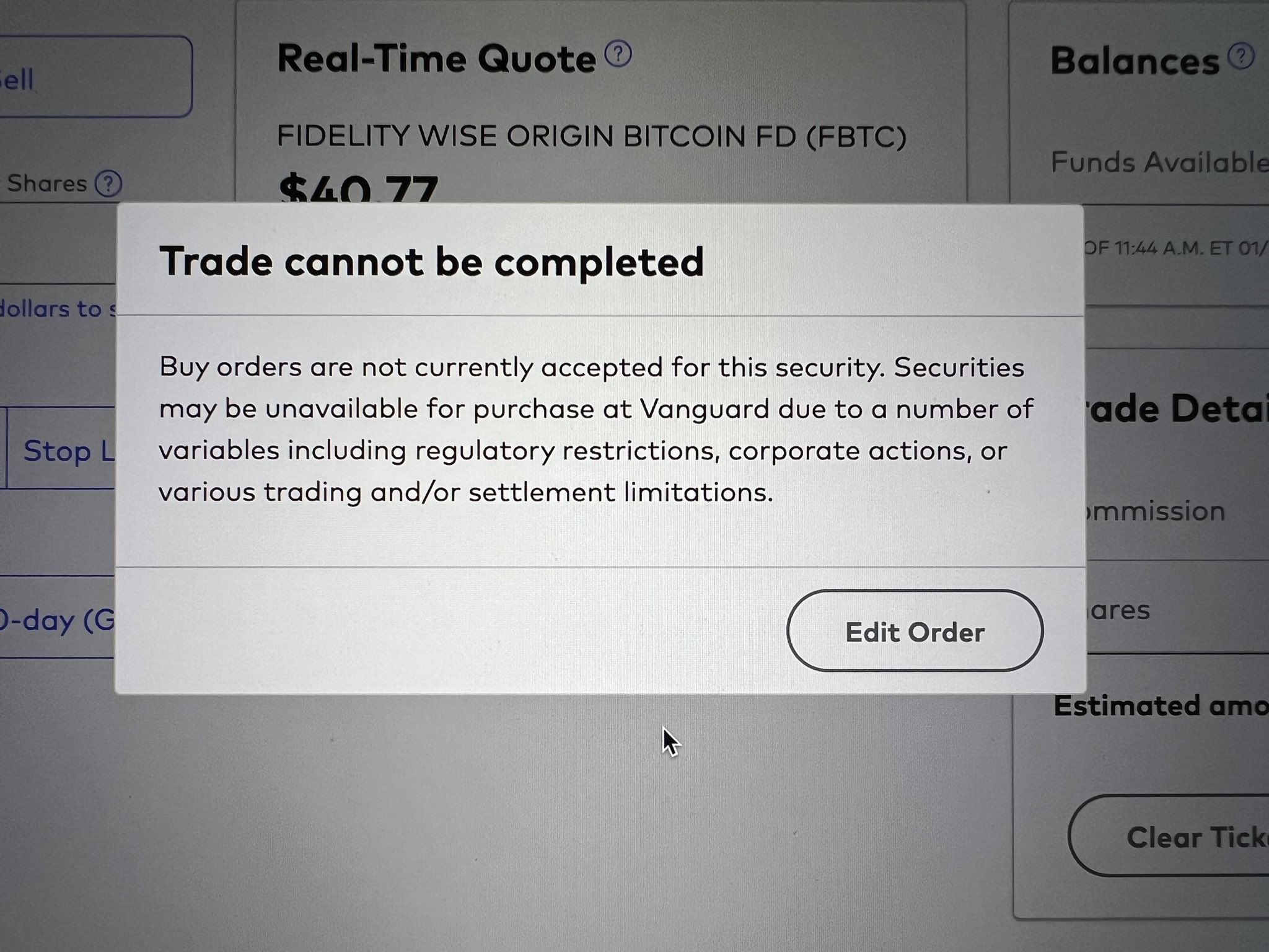 Vanguard, Citi, Merrill, Edward Jones y UBS son algunas de las plataformas en las que estos ETF no se encuentran listados. En el caso de Vanguard, por ejemplo, hay quienes reportan que ya no les permite adquirir acciones de GBTC (que a partir de hoy deja de ser un fondo que cotiza en mercados secundarios y pasa a ser un ETF), pero sí venderlas. Vale aclarar que en el sitio web de Vanguard abierto a todo público (no solo usuarios) se muestra a GBTC como un activo comerciable en su plataforma. Pero, al querer comprar GBTC se informa que la transacción no puede ser completada: