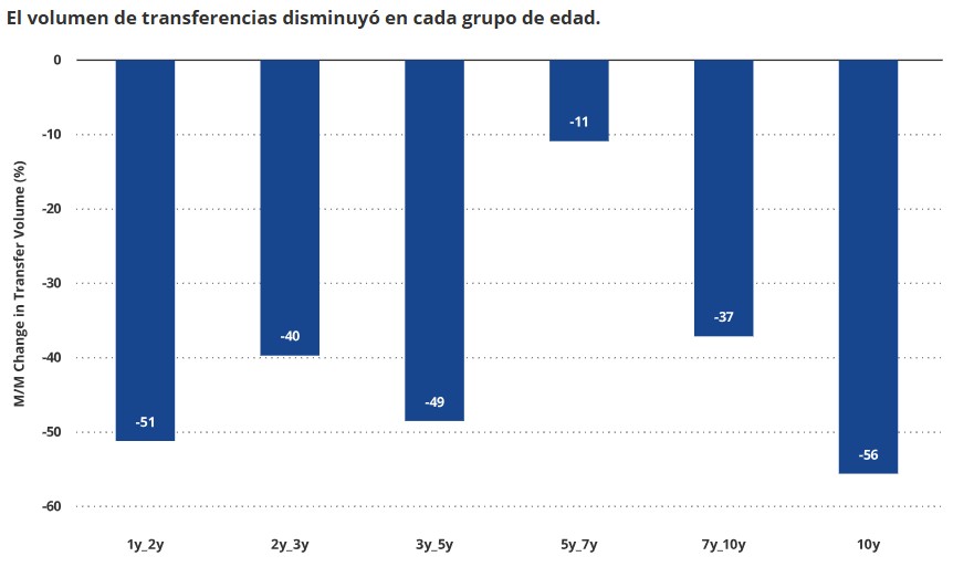 El siguiente gráfico muestra el cambio porcentual intermensual en el volumen de transferencias. Al ser todos los valores negativos, se confirma que la actividad de venta o movimiento se ha desplomado en todos los grupos. La disminución promedio es de -40% entre todos, incluyendo los que compraron sus monedas desde hace 10 años hasta un año.