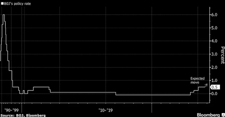 El Banco de Japón (BoJ) se encamina a realizar su primera subida de tasas de interés en 11 meses, una decisión que podría tener implicaciones indirectas para bitcoin (BTC) y los mercados globales.