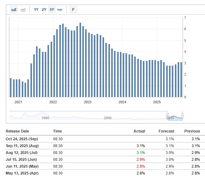 El dato, correspondiente a septiembre, se conocerá a las 12:30 UTC y se espera una variación interanual del 3,1%, igual al registro previo.