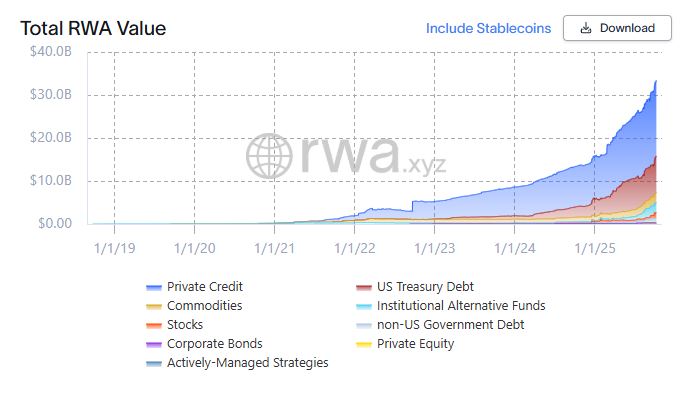 El impulso de esta tendencia queda reflejado en el fuerte crecimiento del mercado de RWA, cuya capitalización se ha duplicado en lo que va de 2025. Actualmente, alcanza los 33.650 millones de dólares, según se muestra en el siguiente gráfico: