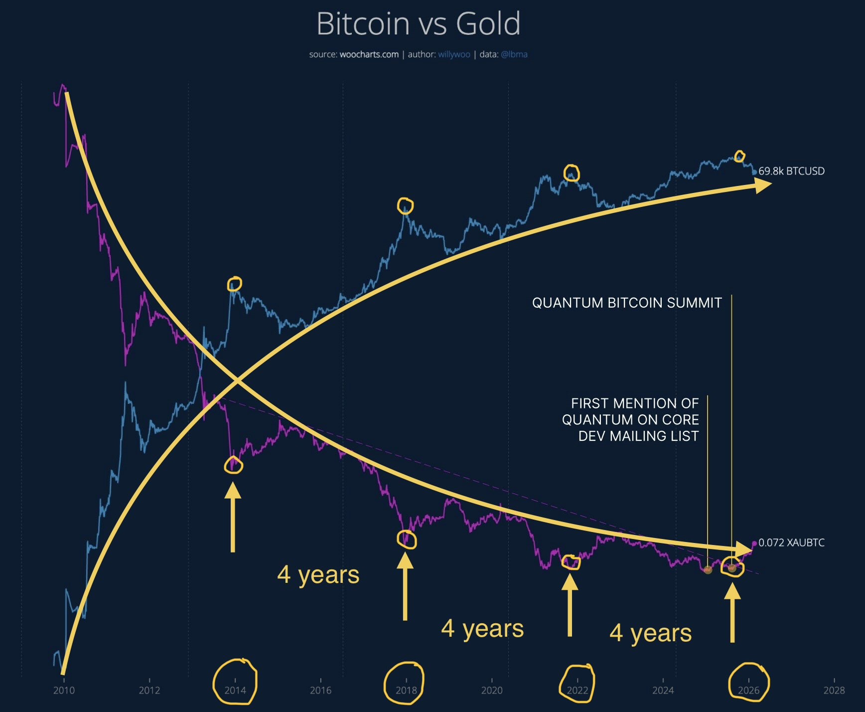 El analista de mercados Willy Woo lanzó una serie de mensajes este 16 de febrero en los que vinculó la reciente debilidad de bitcoin con la aparición del riesgo cuántico. Destacó al respecto que, en este escenario, la tendencia alcista de 12 años que lleva la moneda digital con el oro se rompió.