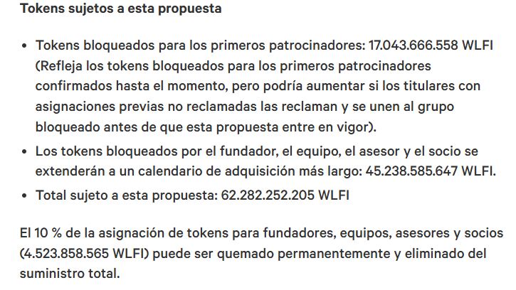 El plan distingue entre distintos grupos de tenedores. Por un lado, los primeros patrocinadores (con 17.043 millones de WLFI) quedarían sujetos a un período de espera de 2 años, seguido de una liberación gradual durante otros 2 años.