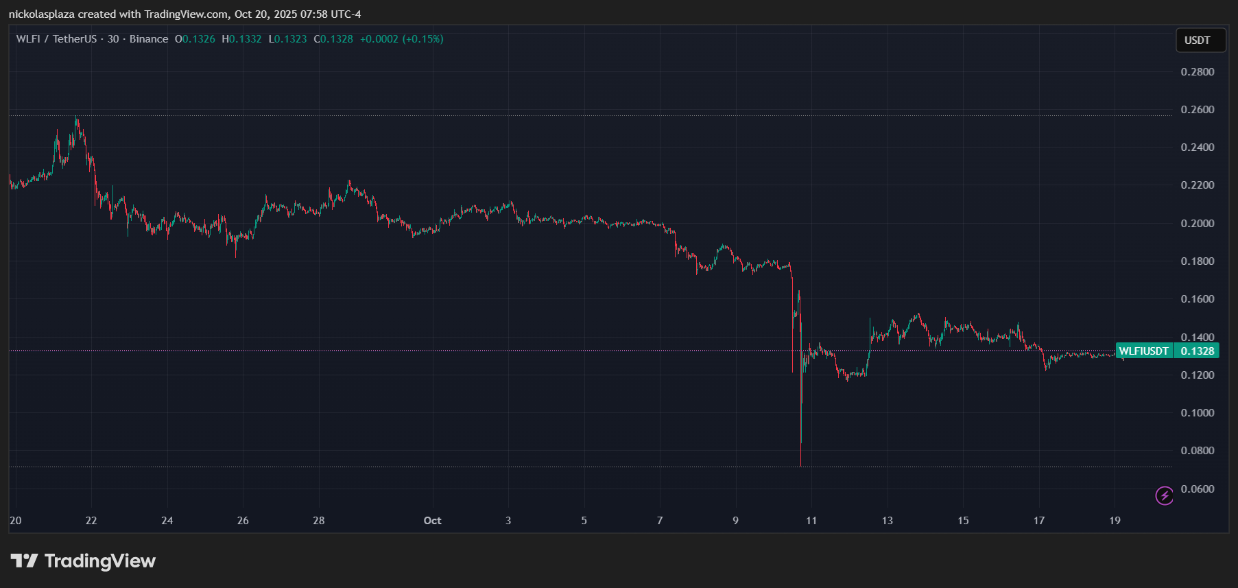 Como reportรณ CriptoNoticias, el token debutรณ en el exchange de bitcoin (BTC) y criptomonedas Binance el pasado 1 de septiembre, aunque su precio entrรณ en tendencia bajista desde el lanzamiento. En el รบltimo mes, WLFI cayรณ un 40%, desde 0,22 dรณlares hasta 0,13 dรณlares, como se aprecia en el siguiente grรกfico.