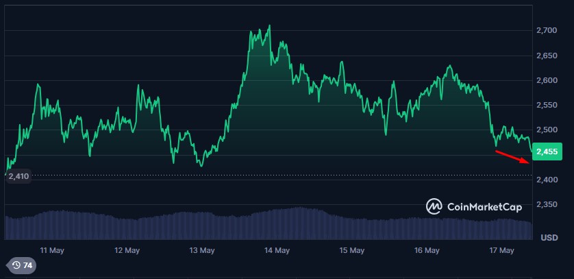 El ether, criptomoneda de Ethereum y la segunda por capitalizaciรณn del mercado, retrocediรณ 5,80% en las รบltimas 24 horas, aunque su saldo en los รบltimos 7 dรญas sigue siendo positivo, con cerca del 2% de revalorizaciรณn en ese periodo. Su precio se ubica en 2.450 dรณlares al momento de la redacciรณn.