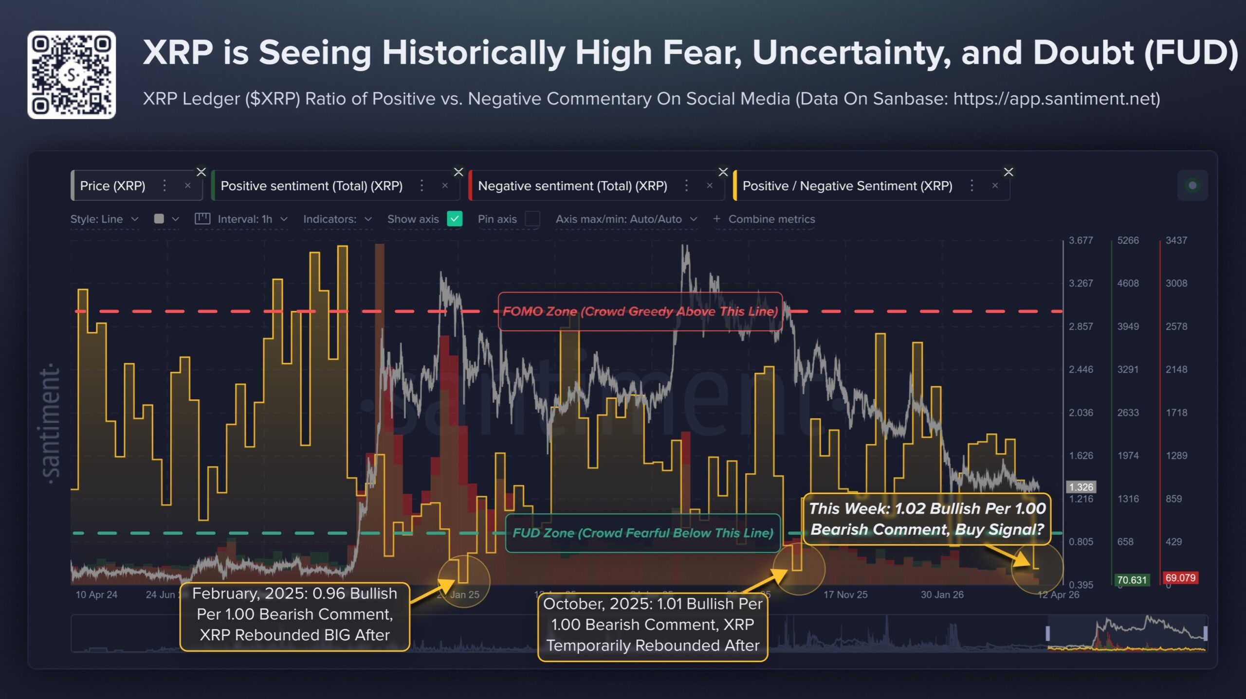 La criptomoneda XRP, emitida por la empresa Ripple Labs, registró ayer, 12 de abril, su nivel de sentimiento social más bajista y pesimista de los últimos dos años entre la comunidad de inversores.