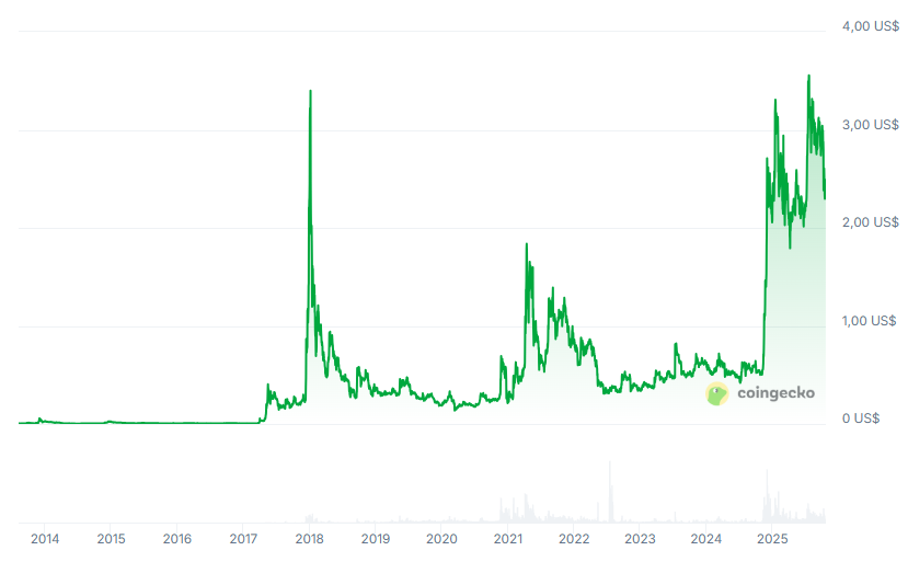 Tal como se observa en el gráfico anterior, XRP cotiza a 2,40 dólares por unidad al momento de esta publicación y ha marcado máximos históricos este mismo año.