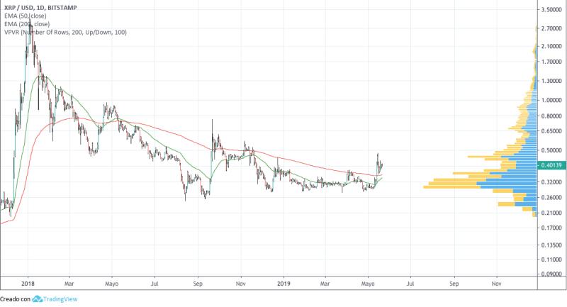 Por otro lado, En el grafico diario que sigue, los promedios móviles (EMA) de 50 (verde) y 200 (rojo) periodos no se han cruzado de manera alcista desde su registro histórico. Los cruces en las EMAS son pruebas de fuego para cualquier tenencia dada ya que exponen el estado del activo en un momento dado. Si bien es cierto que aún Ripple no cumple con tal confirmación, el quiebre del EMA de 200 el pasado 12 de mayo es un buen indicativo de las futuras acciones del precio.
