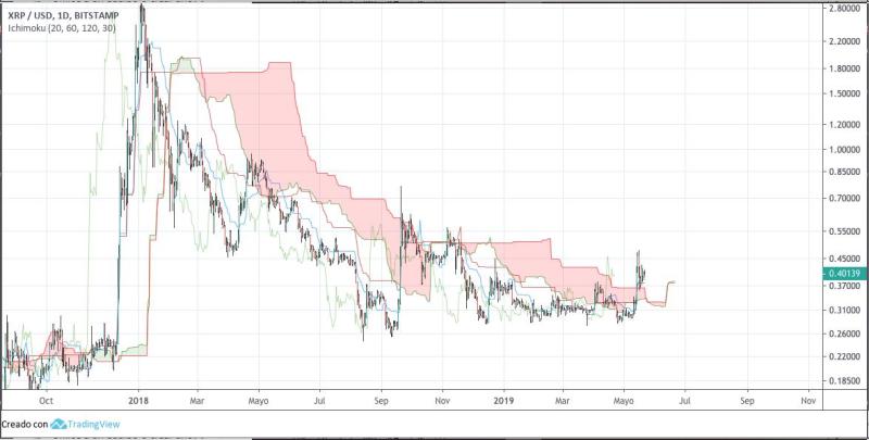 En la temporalidad diaria, las métricas de la nube son 100% optimistas desde enero del 2018. El precio está por encima de la Nube, la Nube es alcista, las líneas de TK están cruzadas de manera alcista y el Intervalo de retraso está por encima de la Nube y del precio. Una entrada a largos se disparó el pasado 18 de mayo cuando el precio probó el soporte de los USD 0,38. El kumo plano en los USD 0,422 y los USD 0,51 deberían actuar como un imán para el precio si no se rompen los mínimos actuales, siendo estos objetivos claves para una próxima expansión.