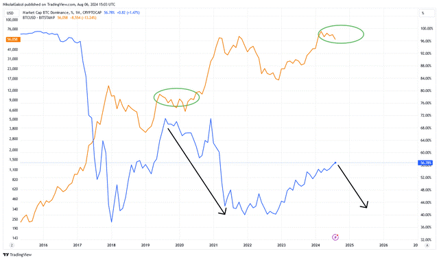 En su caso, reveló que puede que, en los próximos meses, haga una rotación de parte de su posición en BTC hacia ETH, mientras decaiga el dominio de bitcoin exhibido a continuación. “Tiene mucho sentido desde una perspectiva de riesgo/recompensa, especialmente cuando las tasas de interés ya han caído y los precios de los activos se han corregido a la baja”, dijo.