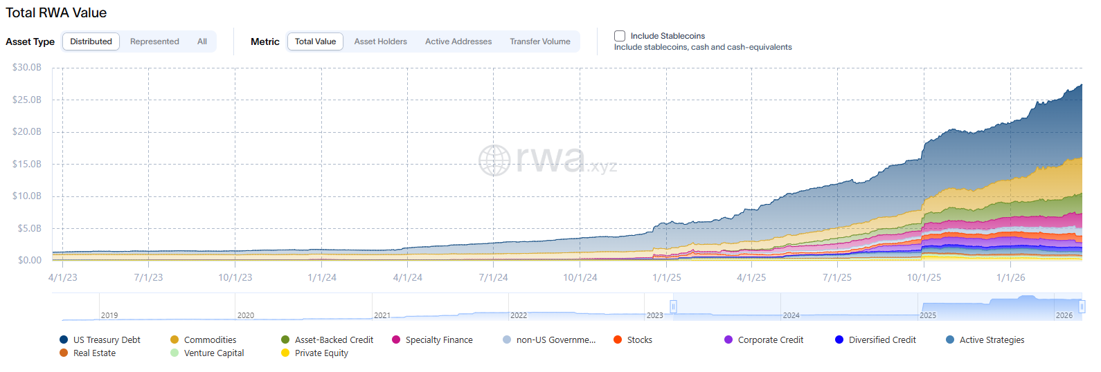 La industria RWA se consolida como una de las principales líneas de desarrollo dentro del sector de activos digitales. Su capitalización de mercado alcanza los 27.320 millones de dólares.