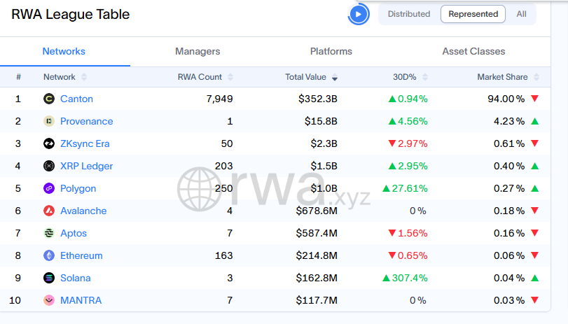 Según el portal RWA.xyz, bajo la categoría “represented” (que agrupa los activos del mundo real tokenizados cuyo valor está registrado o reflejado en la red, aunque su propiedad o distribución no ocurra necesariamente de forma totalmente onchain), XRP Ledger se ubica como la cuarta red con mayor valor depositado en RWA.