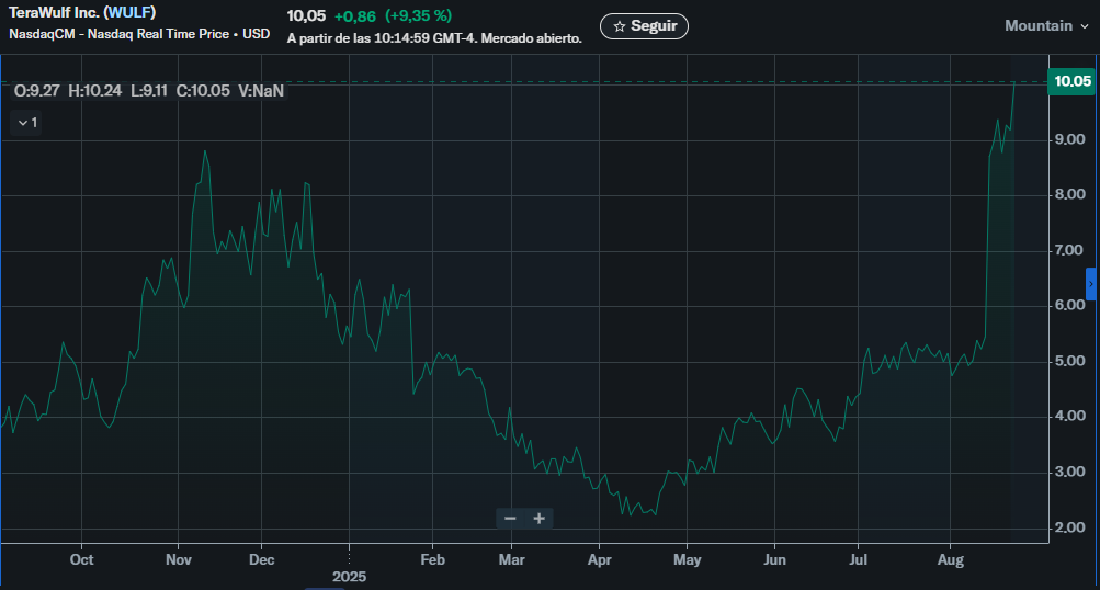Las acciones de TeraWulf (WULF), una empresa estadounidense dedicada a la minería de Bitcoin, subieron casi un 100% desde el 13 de agosto, superando actualmente los 10 dólares por unidad, un nivel no visto desde febrero de 2022.