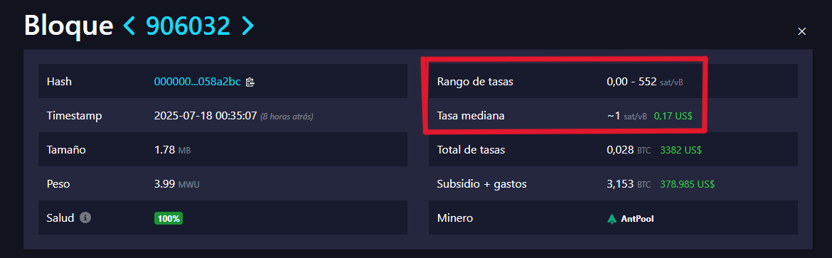 El bloque 906032, minado por AntPool, ejemplifica ese comportamiento. Este bloque presentó una tasa mediana de aproximadamente 1 sat/vB, equivalente a 0,17 dólares, con un rango de tarifas que osciló entre 0,00 y 552 sat/vB.