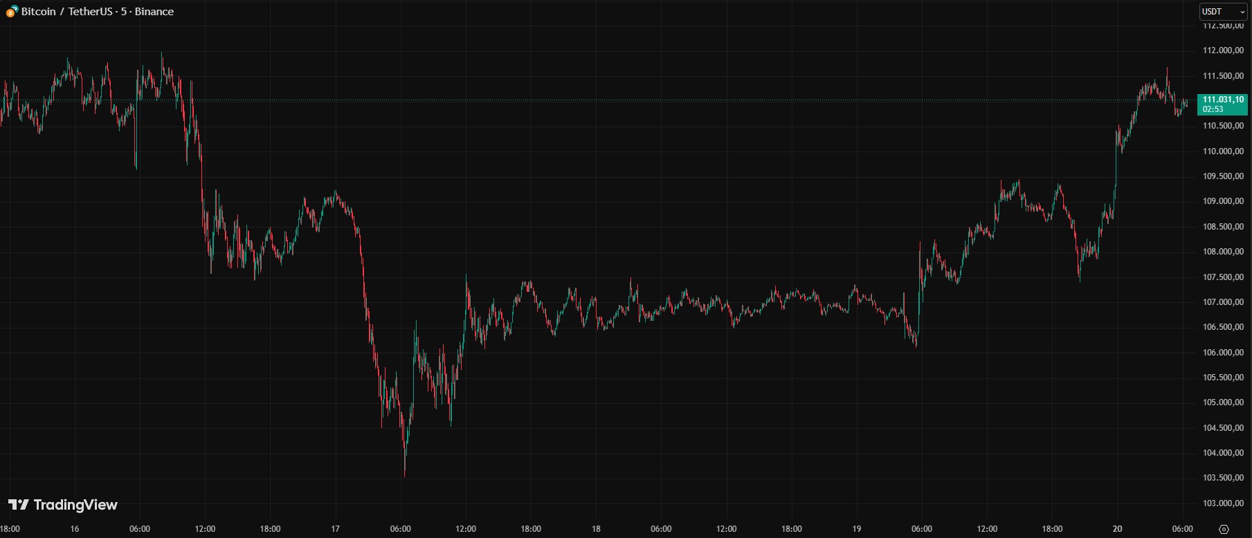 Según el comportamiento del precio de bitcoin durante los últimos cinco días, el activo registró una caída pronunciada a mediados del período, seguida de una fase de consolidación y una posterior recuperación que lo llevó a superar los 111.000 dólares al momento de escribir este reporte, según la Calculadora de Precios de CriptoNoticias.