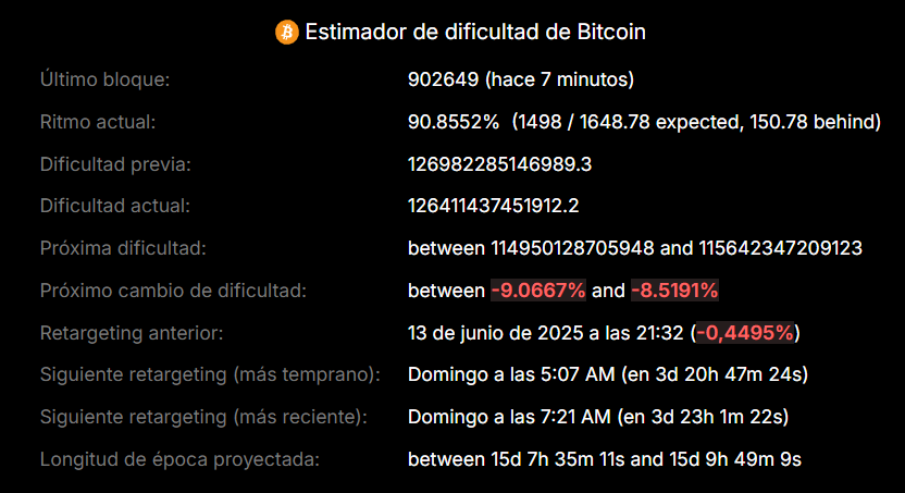 Según Newhedge, una plataforma de métricas de Bitcoin, se estima que la dificultad caerá entre -9.2% y -8.65% aproximativamente. Se espera que dicho descenso ocurra en los tres o cuatro días siguientes a la redacción de esta noticia.