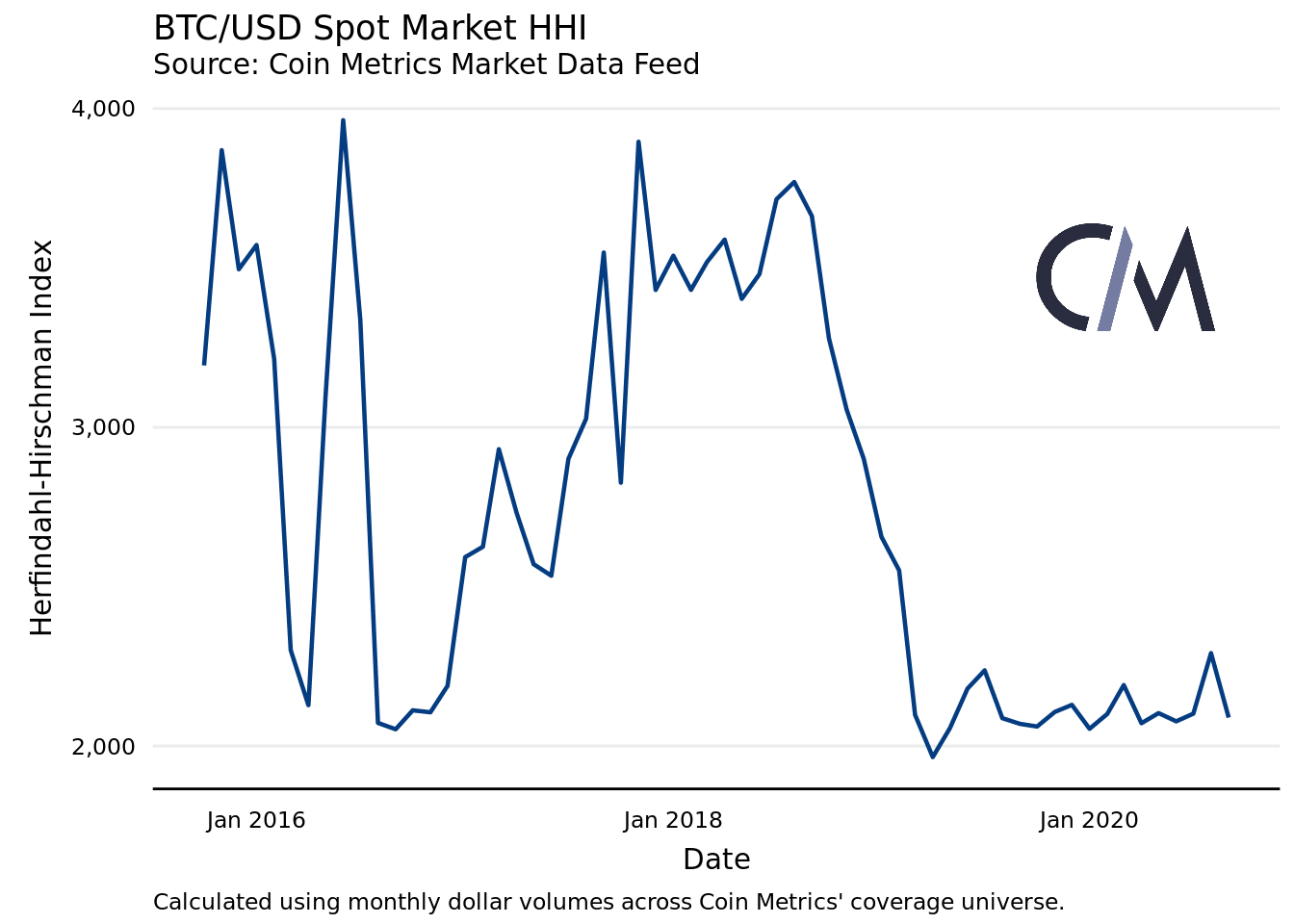 Aquí puede aplicarse el índice Herfindahl-Hirschman (IHH) que aumenta a medida que un mercado se vuelve más monopólico. IHH se calcula al elevar al cuadrado el porcentaje de participación de mercado de cada empresa que compite en un mercado (en este caso, los exchanges), para luego sumar los números resultantes. Puede dar un número entre 0 y 10.000.