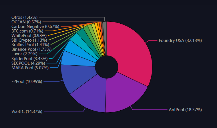 De acuerdo con datos de mempool.space, cuatro pools de minería de BTC controlan un poder de procesamiento de casi el 75% del total del hashrate aportado por los pools. Estos son Foundry USA, Antpool, ViaBTC y F2pool.
