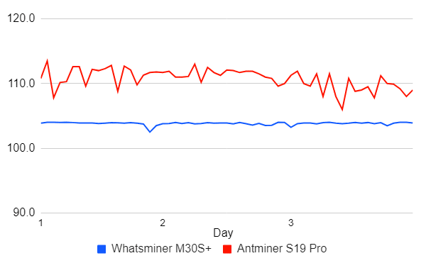 BitMEX probó únicamente el modelo M30S+, descubriendo que, con su última versión de firmware puede alcanzar los 103,8 TH/s de hash rate, mejorando su poder de cómputo un 3,8% en comparación a las expectativas iniciales de venta. Asimismo, el minero tiene un modo de “alta potencia”, el cual puede alcanzar hasta 109,4 TH/s de hash rate con un mayor gasto de energía. No obstante, su eficiencia se mantiene en valores aceptables, con 34,3 J/TH al activar este modo especial.