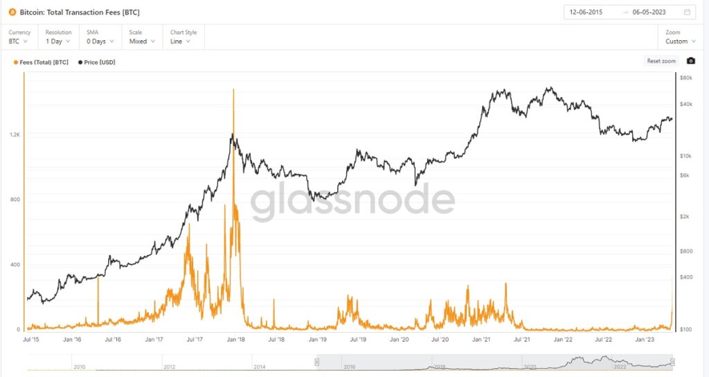 Tal situaciรณn no se daba desde 2021, como refleja el sitio Hashrate Index. Y la tendencia que muestran otros sitios de mรฉtricas on-chain, como Glassnode, indica que los 403 bitcoins abonados en total por comisiones el 7 de mayo igualan nรบmeros inรฉditos desde principios de 2018.