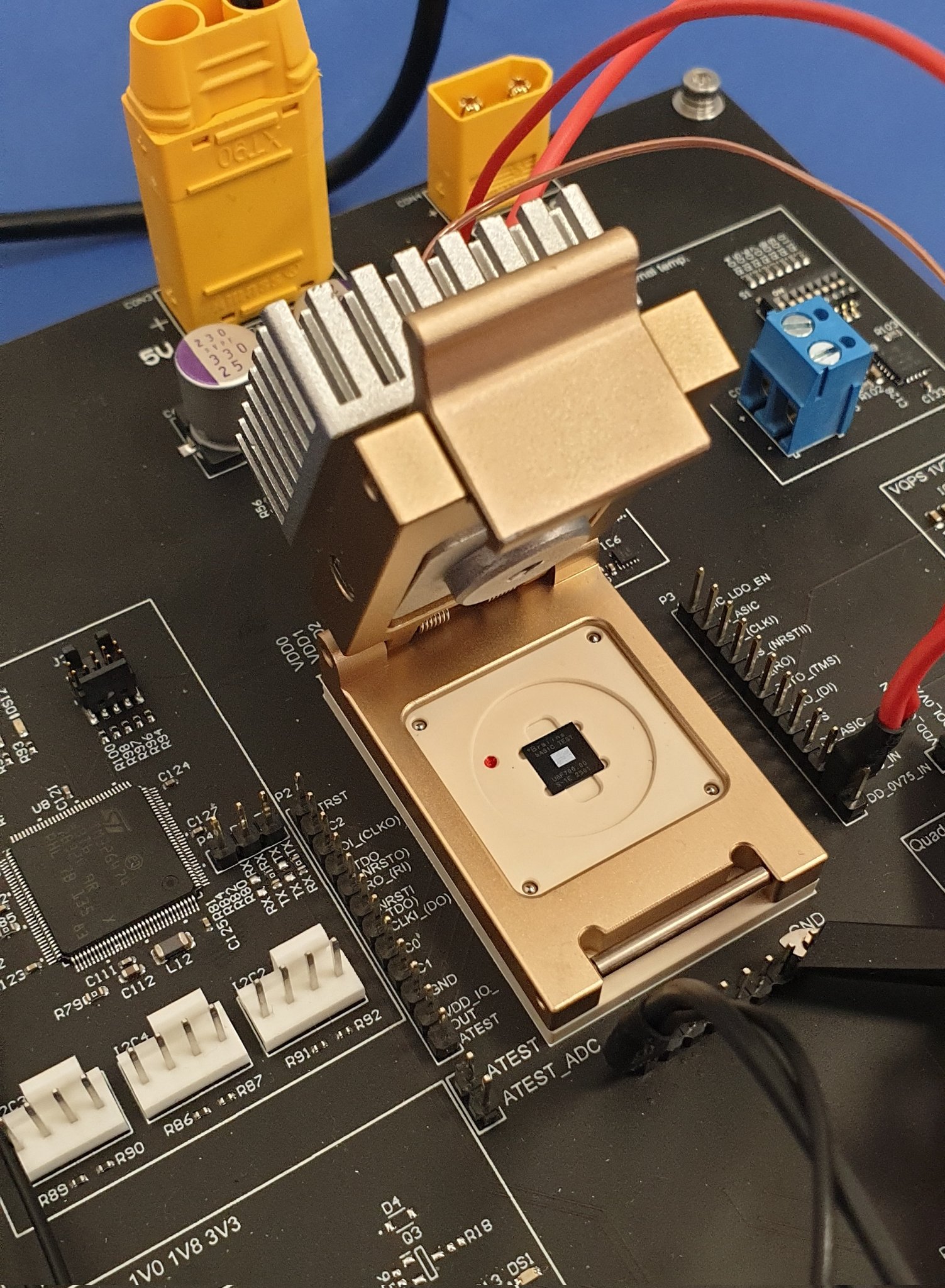 El dispositivo está hecho a medida y el chip no está soldado, ya que necesitamos revisar muchos de ellos. Un dato curioso: hay una sonda de temperatura que pasa por el medio del disipador de calor hasta el paquete para que podamos medir la temperatura correctamente.