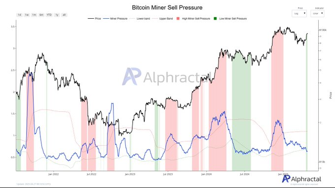 Las ventas de bitcoin (BTC) por parte de los mineros han alcanzado su nivel más bajo en los últimos 12 meses, conforme a datos de la plataforma de análisis on-chain Alphractal. Desde mayo de 2024 no se registraba una presión de venta tan reducida por parte de este sector de la red.