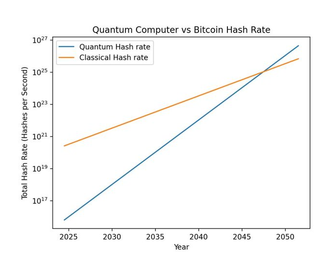 Ese cambio surge de su nueva hipótesis: para 2046, los mineros de Bitcoin habrían adoptado la computación cuántica en su hardware, lo que aumentaría colectivamente la tasa de hash de la red, ajustando dinámicamente la dificultad para mantener la seguridad.