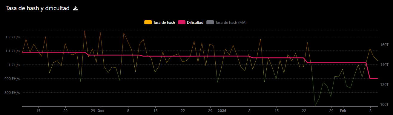 Esta dinámica muestra la reacción del protocolo ante la falta de potencia: cuando el hashrate cae bruscamente, la producción de bloques se ralentiza. Sin embargo, la rentabilidad no mejora realmente hasta que la red ajusta su dificultad a la baja, tal como sucedió el pasado 7 de febrero.