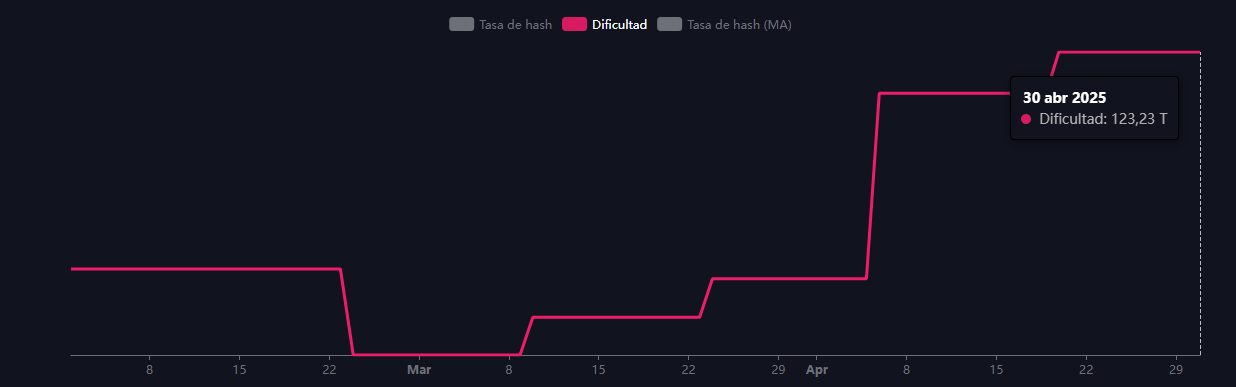 El pasado 5 de abril, luego de que la red creada por Nakamoto registrara ese pico en su poder de procesamiento, la dificultad de minar Bitcoin trepó al alza un 7%, marcando un máximo histórico de 121 billones. En su último ajuste, el 19 de ese mismo mes, esa medición subió a los 123 billones, una cifra que se mantendrá hasta el 4 de mayo.