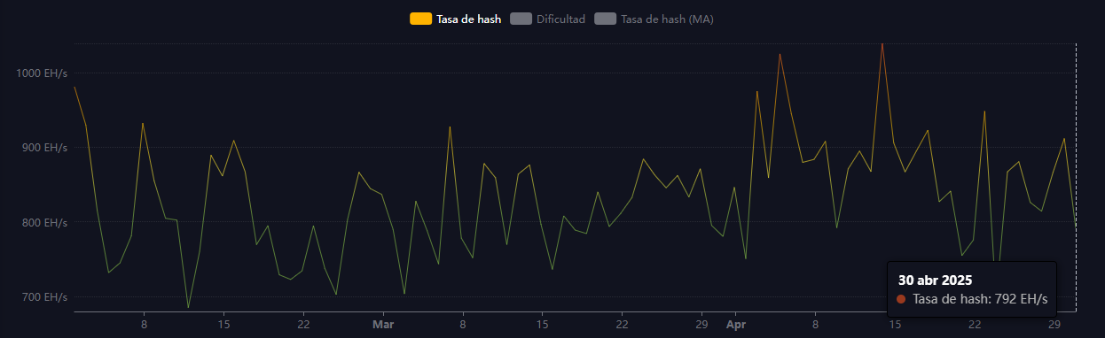 El hashrate de Bitcoin, que en abril de 2025 alcanzó por primera vez el hito de 1 ZH/s, ha mostrado una caída significativa en la actualidad según mempool.space. Al momento de redactar este artículo, esa métrica se sitúa en 792 exahashes por segundo (EH/s), lo que representa una disminución del 13% respecto a los 911 EH/s registrados en la jornada anterior.