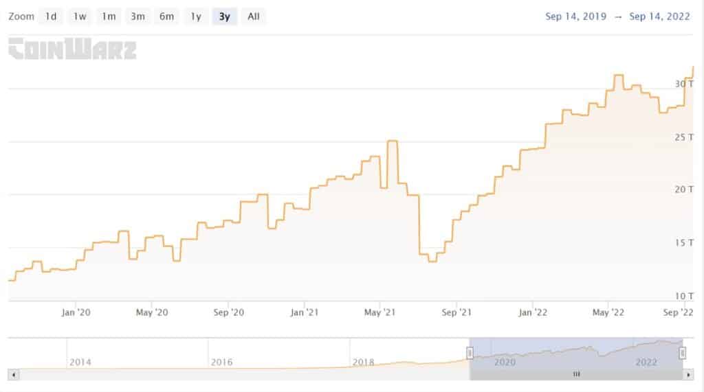 La dificultad anterior para minar bloques en Bitcoin fue de 30,97 T entre el 31 de agosto y el 13 de septiembre. El incremento, que sitúa a esta medición en su máximo histórico, es del 3,45%. El último ATH de dificultad había sido en mayo de 2022.