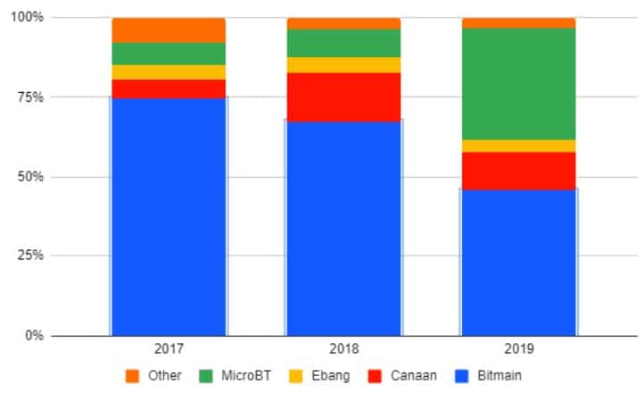 En el grรกfico anterior se aprecia que de una penetraciรณn de 75% en el mercado de mineros ASIC en 2017, Bitmain llegรณ al final de 2019 con menos de la mitad de esa penetraciรณn de mercado. MicroBT experimentรณ el mayor crecimiento de 2018 a 2019, para alcanzar el segundo lugar ese aรฑo, con un 35% de penetraciรณn de mercado.