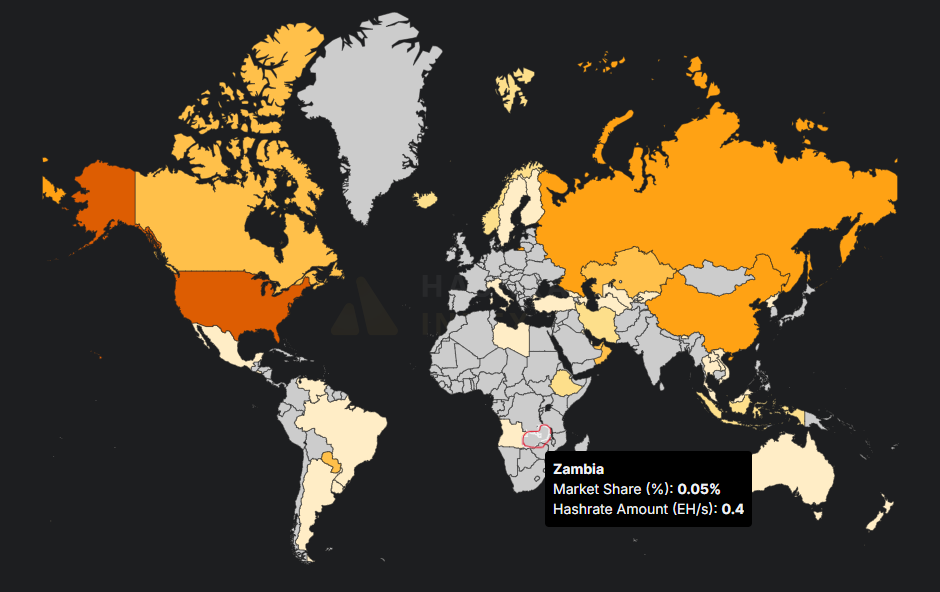 Al momento de este artículo, Zambia mantiene un hashrate total de 0,4 EH/s (exahashes por segundo), aportando un 0,05% del poder de cómputo total de la red Bitcoin, según Hashrate Index.