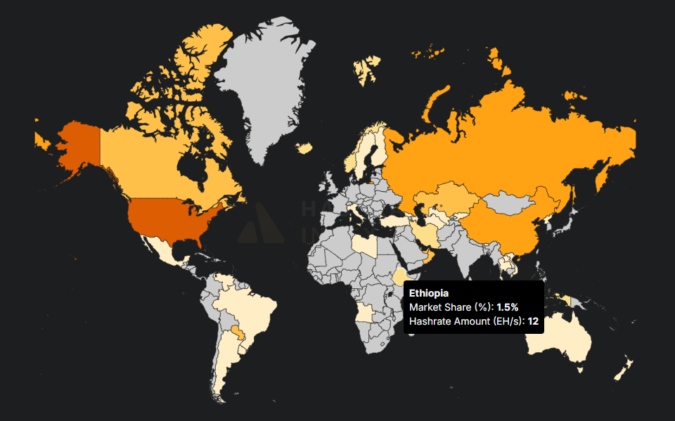 Como lo reportó CriptoNoticias en febrero de 2024, la prohibición de la minería de bitcoin en China produjo que muchos de esos actores migraran a otros territorios. Y Etiopía fue uno de ellos. Así, en la actualidad, el auge de la minería de BTC le proporciona a este país africano una capacidad de procesamiento de 12 EH/s (exahashes por segundo), representando el 1,5% del hashrate global de Bitcoin, según Hashrate Index.