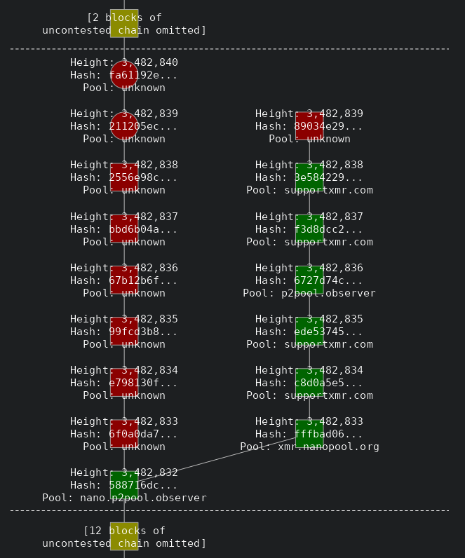 Los bloques de la derecha representan el fragmento de cadena original, como puede deducirse de que varios bloques de la misma fueron minados por distintos pools, como supportxmr, P2pool y xmr.nanopool.