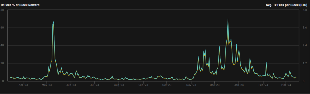 Aunque el aumento de precio eleve las ganancias al medirlas en dólares, las comisiones en BTC tuvieron puntos más altos que los actuales. Durante mayo y diciembre de 2023, los mineros llegaron a ganar más bitcoins mediante las comisiones pagadas en cada bloque que por la recompensa de 6,25 que otorga el protocolo.