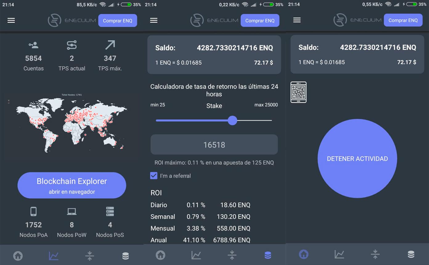 La minería en teléfonos móviles prácticamente no requiere inversiones: solo necesita una aplicación y 25 ENQ (US$ 0,5). La red de prueba Enecuum tiene más de 1.200 nodos móviles de 50 países.