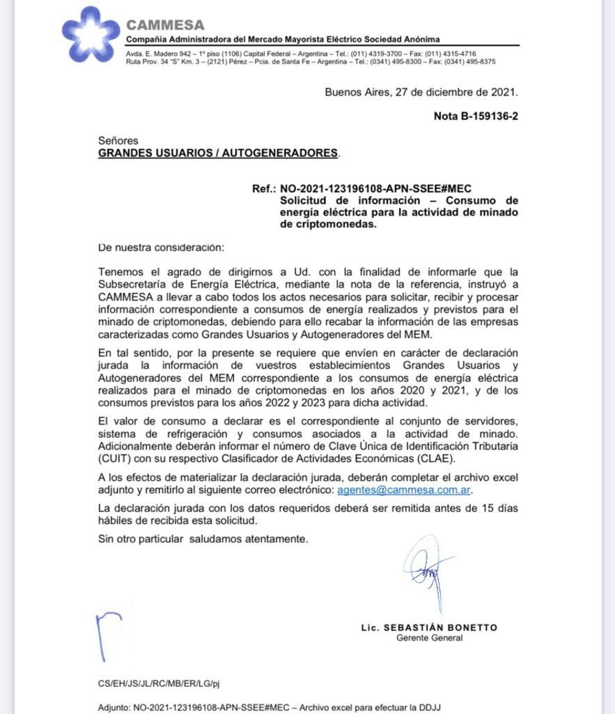 La Compañía Administradora del Mercado Mayorista Eléctrico Sociedad Anónima (CAMMESA) envió a los grandes usuarios y autogeneradores de electricidad una carta en la que se solicita que brinden detalles sobre sus actividades de minado de criptomonedas.