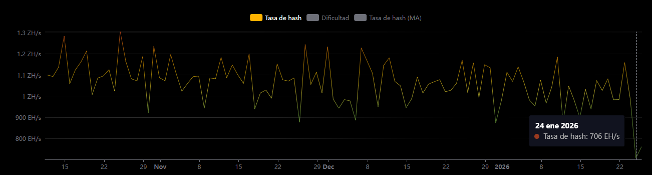 El poder de cómputo (hashrate) de Bitcoin tuvo un descenso brusco en pocos días. El 22 de enero se ubicaba en niveles de 1.160 EH/s (exahashes por segundo) mientras que este 24 de enero marcó 706 EH/s , lo que representa una caída de 39,1% en 48 horas.
