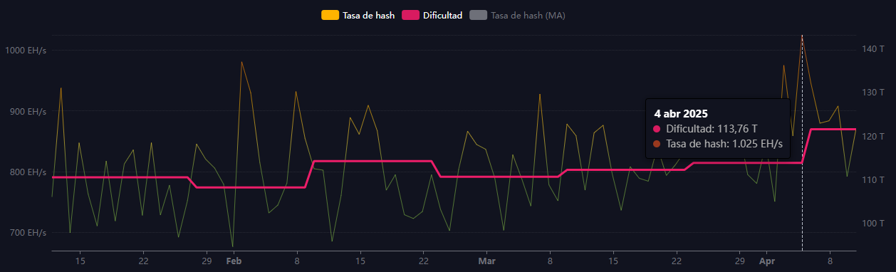 Ese pico de actividad computacional no solo reflejó la robustez de la red, sino que, además, solo un día después, el 5 de abril, condujo a que la dificultad de minado se disparara casi un 7%, llegando a un máximo sin precedentes de 121 billones. Esta cifra, que determina cuán complejo es minar un nuevo bloque, se mantiene vigente y enfrentará su próximo ajuste automático el 19 de abril.