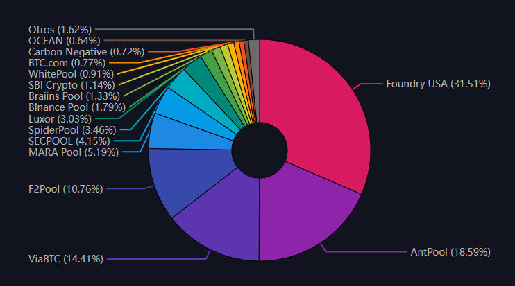 La distribución del hashrate también está mediada por los pools de minería, como Foundry USA, AntPool, F2pool o ViaBTC, que aglutinan el poder computacional de miles de participantes.
