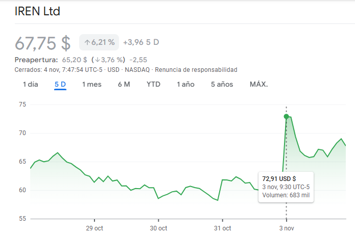 Al viernes 31 de octubre, IREN cotizaba en los 60,75 dรณlares. El lunes 3 de noviembre, cuando se conociรณ el acuerdo millonario, las acciones de esa minera subieron hasta un mรกximo de casi 73 dรณlares, lo que implica un 20%, como se ve en la siguiente imagen: