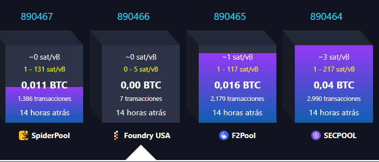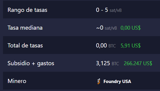 Mientras, el subsidio por minar el bloque fue de 3,125 BTC, lo que corresponde a la recompensa normal actual tras el último halving de 2024. Este subsidio, sumado a las inexistentes comisiones, dio un ingreso total de 3,125 BTC para Foundry USA, equivalente a USD 266.247 dólares al momento de la minería.