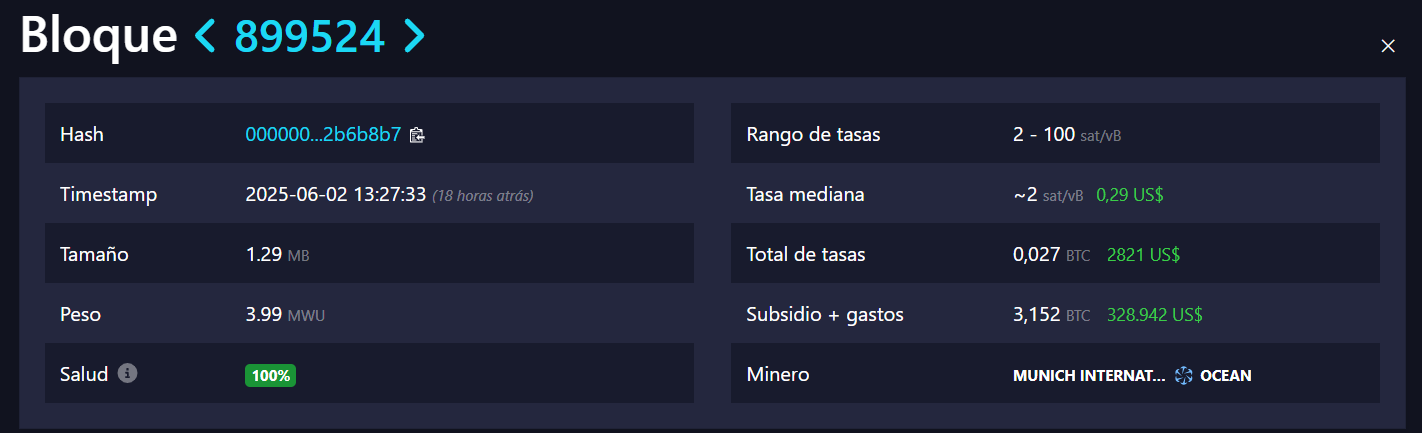 El bloque minado por MIM generó un total de 3,15 BTC, o 328.000 dólares, por subsidios de bloque; y unos 0,027 BTC o 2.000 dólares por tarifas pagadas de los usuarios al momento de la redacción. Fue minado a través de OCEAN, el pool de minería que impulsa la minería descentralizada y permite la selección de plantillas de minería.