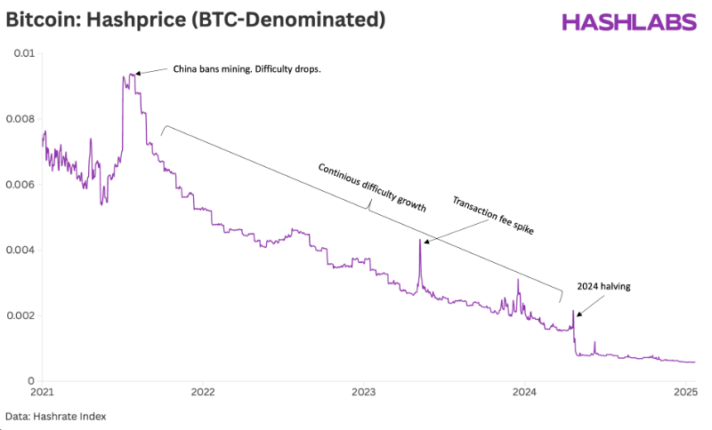 Mellerud acompañó su análisis con el siguiente gráfico de la caída del hashprice medido en BTC: