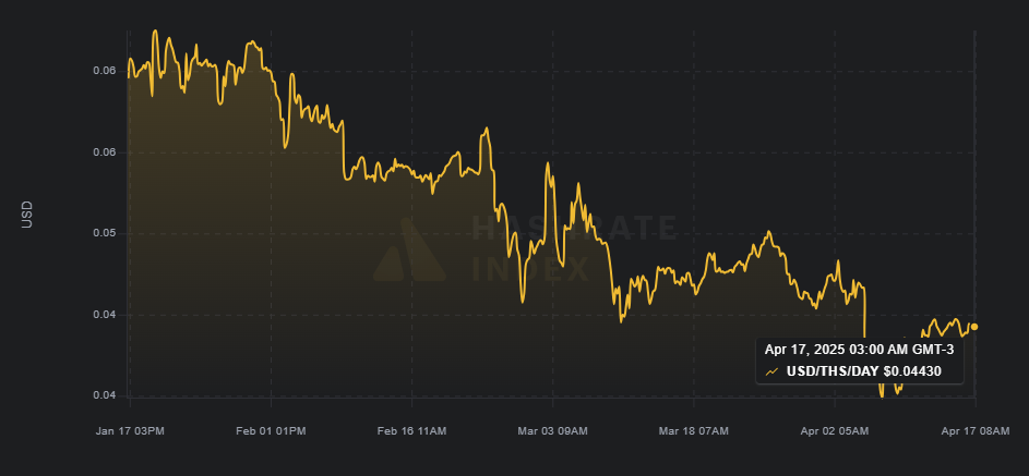 El hashprice de Bitcoin (BTC), una métrica que mide el ingreso diario que un minero puede esperar por cada unidad de hash aportada a la red, ha experimentado una caída sostenida desde mediados de enero de 2025 hasta estancarse en los niveles actuales.